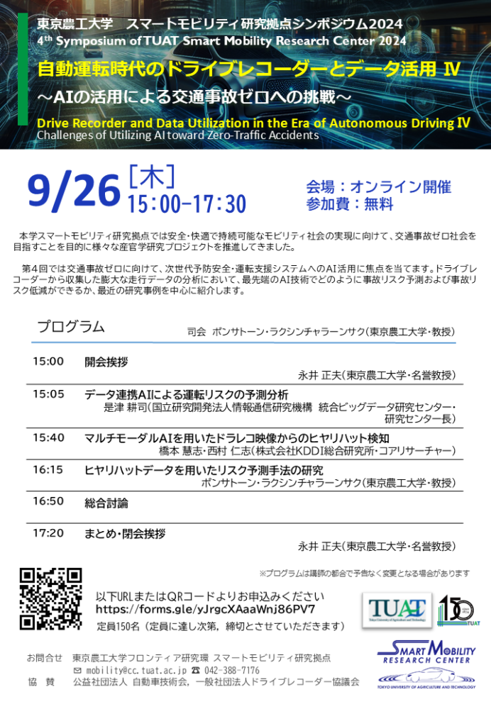 2024年9月26日(木)、本学 フロンティア研究環 スマートモビリティ研究拠点主催「東京農工大学 スマートモビリティ研究拠点シンポジウム2024」が開催されます。