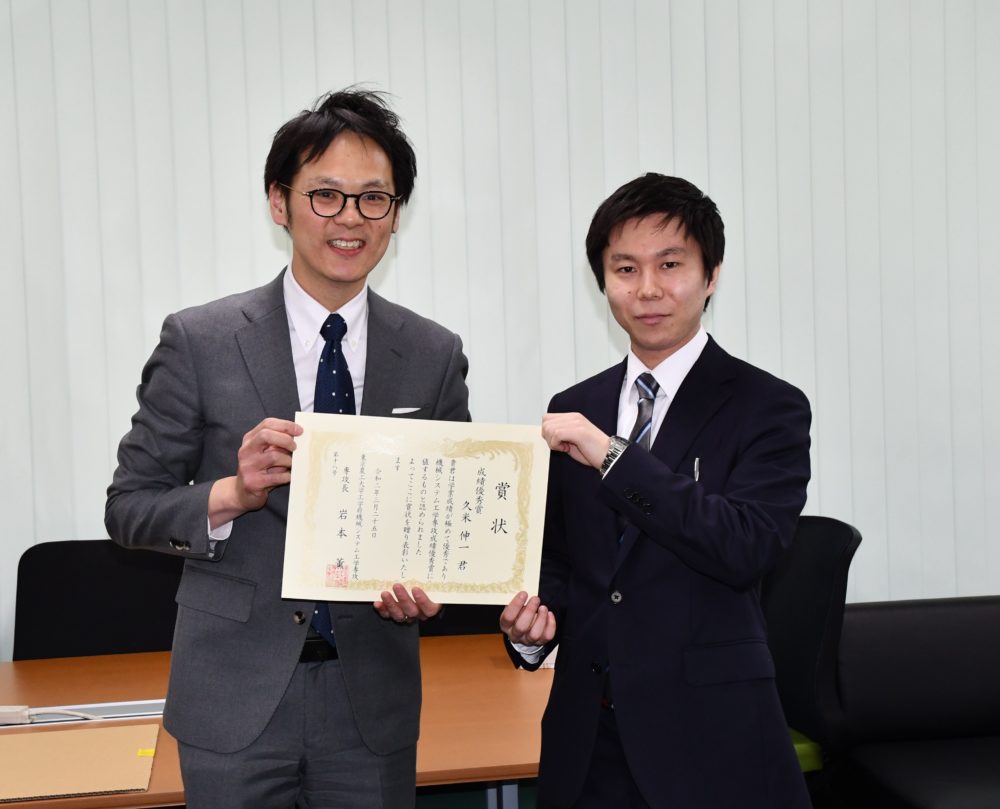 本研究室博士課程前期2年 久米伸一さんが2020年3月25日「機械システム工学専攻 成績優秀賞」を受賞しました。 この賞は学業成績が極めて優秀な学生が表彰されます。