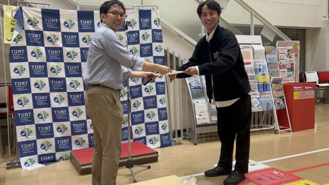 本研究室学部4年 有吉 希生さんが,9月29日に行われました卒業論文中間発表会にて「優秀講演賞」を受賞しました。