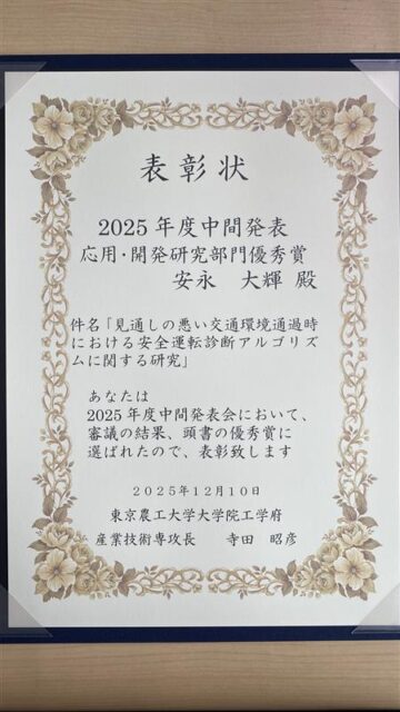 本研究室修士1年 安永 大輝さんが,12月10日に行われました産業技術専攻中間発表会で「応用・開発研究部門優秀賞」を受賞しました。