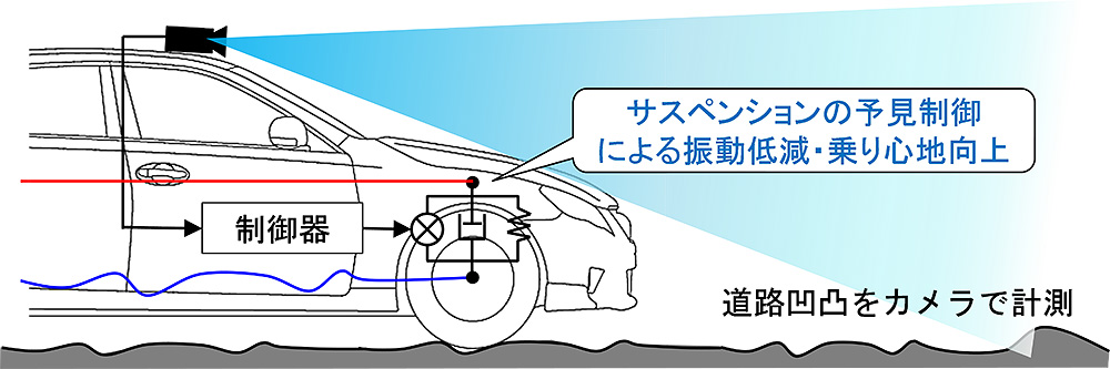 本研究は、自動車の快適性を向上させるサスペンションの予見制御システム(プレビュー制御)に関するものである。ステレオカメラで撮影した前方路面の画像から、リアルタイム路面変位(凹凸)計測を実現した。計測した路面変位を用いてプレビューサスペンション制御シミュレーションを行った結果、従来の制御手法に比べ、乗り心地およびタイヤの接地性向上への効果を示した。