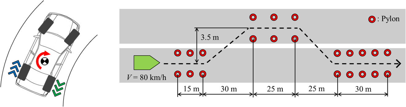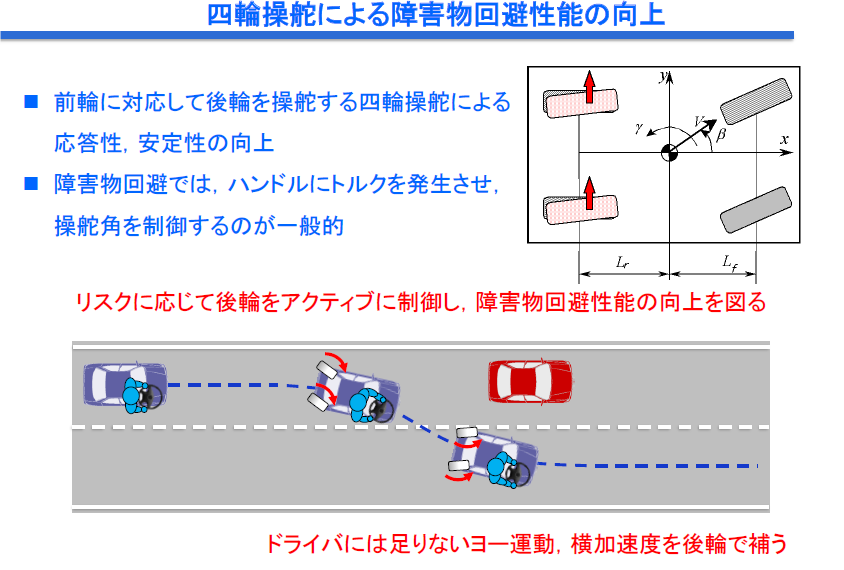本研究は、四輪操舵による障害物回避性能の向上を目的としている。現在、車両の応答性や安定性の向上のために前輪に応じて後輪を操舵する四輪操舵制御などが実装されているが、障害物回避では、ハンドルにトルクを発生させ、操舵角を制御するのが一般的である。本研究では、リスクに応じて後輪をアクティブに制御し、障害物回避性能の向上を図った。具体的には、上記のようなレーンチェンジの場面を想定し、ドライバには足りないヨー運動および横加速度を後輪で補い、シミュレーションによってその有効性を検証した。