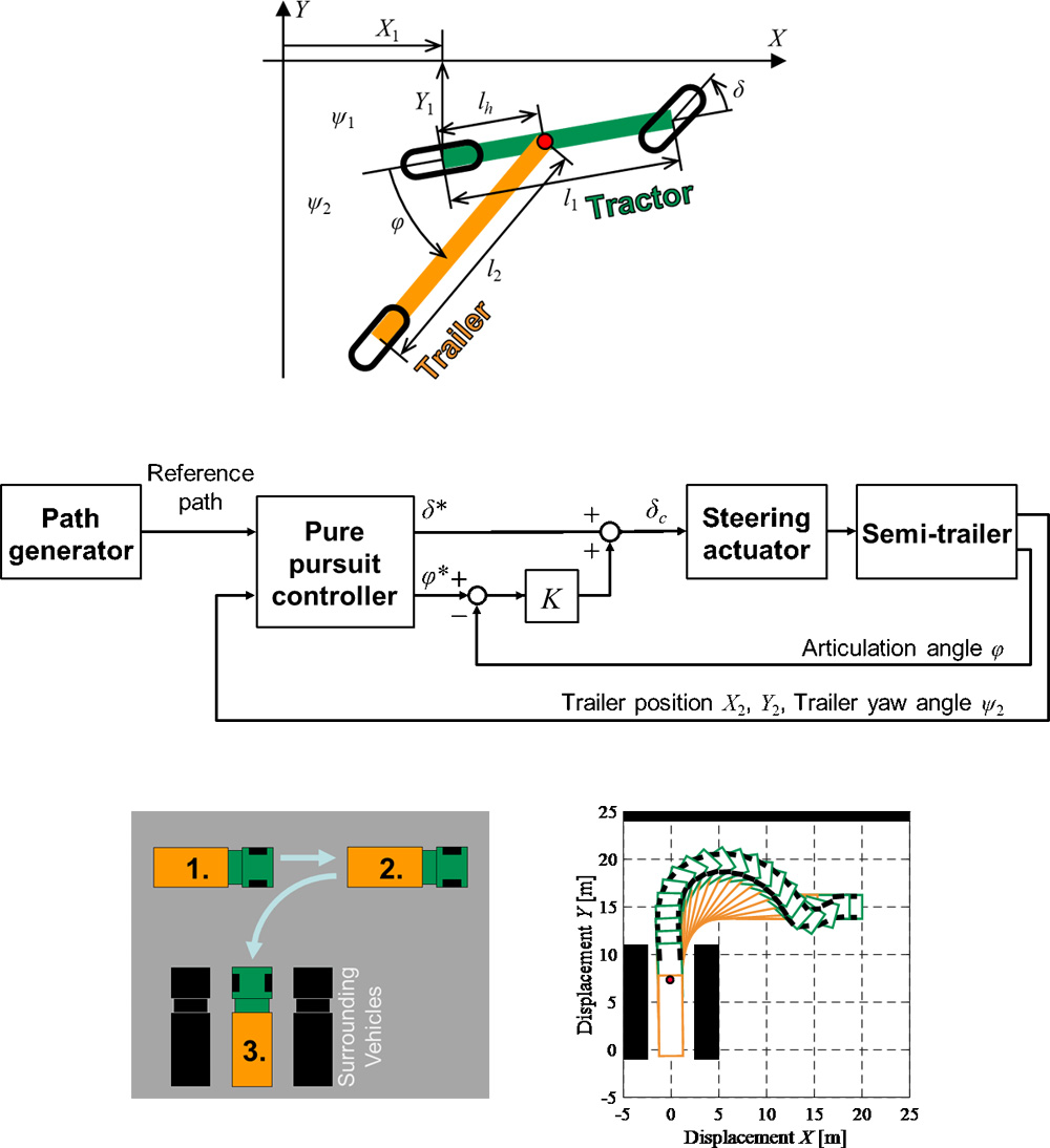 大型商用車ドライバ不足問題で、複雑な運転操作の自動化が求められている。本研究では、セミトレーラーの後退駐車の自動化を目的とし、Pure Pursuit法による Motion Plannerと連結角誤差フィードバック補償に基づく経路追従制御系を構築した。また、自動操舵機構を備える車両にその操舵制御アルゴリズムを実装し、その有効性を検証した。