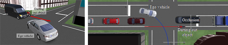 本研究は、交差点右折時において、死角からの飛び出しとの衝突を回避するリスク予測自動ブレーキ制御システムに関するものである。危険予測ブレーキシステムは、仮に死角から二輪車などが飛出してきたとしても緊急回避ブレーキで十分止まれる速度まで予め減速するシステムである。さらに、飛出してきた対象に対し、緊急回避自動ブレーキの作動によって衝突を回避する。実験車両を用いて危険予測ブレーキシステムの有効性を検証した。