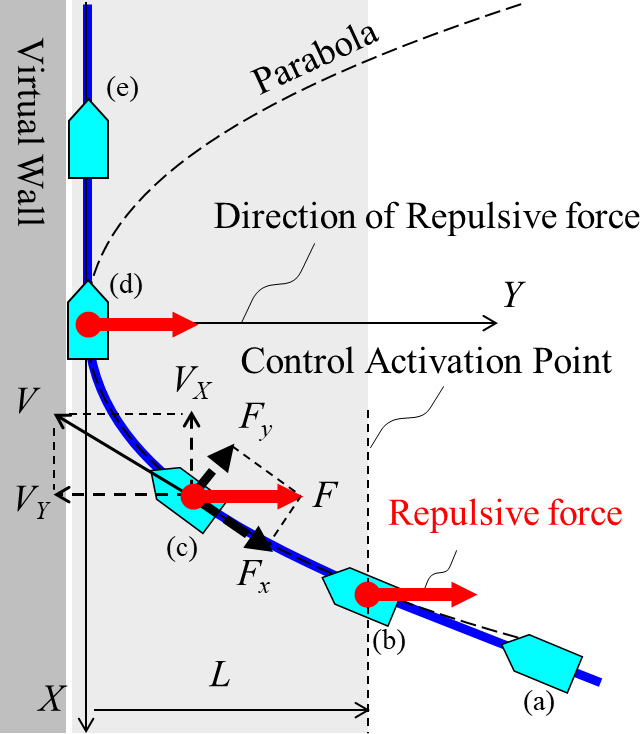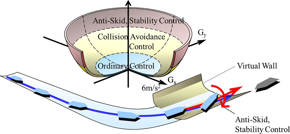 予防安全システムや自動運転システムの想定衝突回避シーンが複雑化するに伴い、タイヤ摩擦限界や各種アクチュエータの特性を考慮し、物理的に理解が容易で合理的な2次元平面上の制御理論が求められている。そこで本研究では、障害物から仮想的に発生する一定の斥力場を想定した2次元的な回避制御手法を提案した。障害物から仮想斥力を受ける考え方によって、前後方向と横方向の制御を統一的に扱うことができる。これにより、減速度と操舵角を統合した衝突回避制御が可能となる。