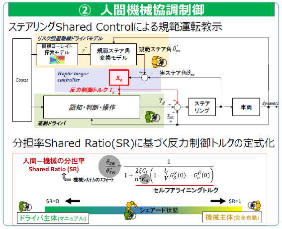 本研究では、曲線路走行場面においてスムーズな運転行動を実現するため、操舵支援制御に加減速制御を組み合わせたシェアード・コントロール型運転支援システムの設計を行った。目標曲率生成に基づく規範操舵ドライバモデルと、その操舵行動に連携した規範加減速モデルを同時に演算可能な規範ドライバモデルを構築し、熟練ドライバによる実路走行データと比較した。また、ドライビングシミュレータ実験を行い、その規範運転教示による車線追従支援効果を確認した。