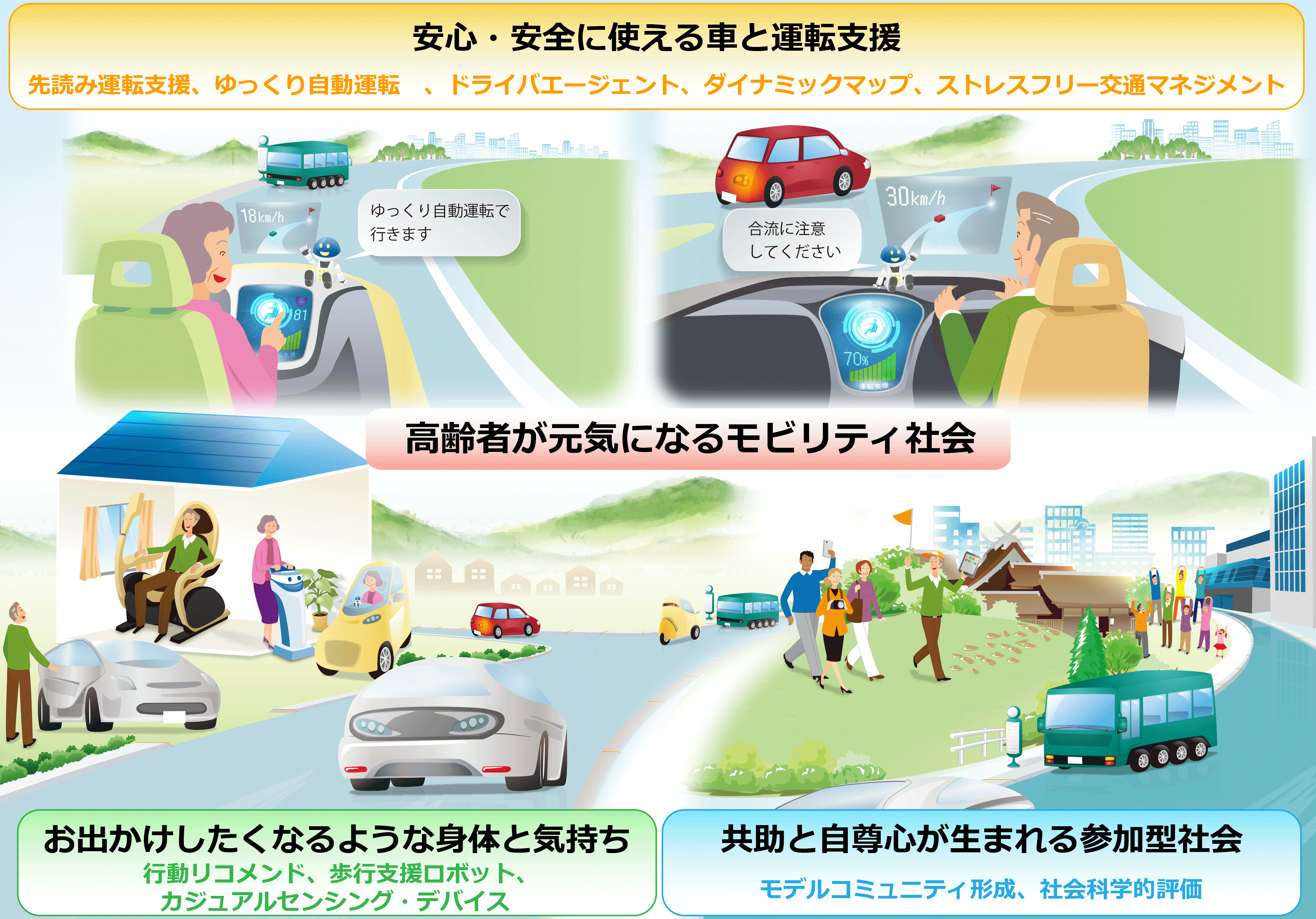 高齢者自身の情報を活用した健康維持と外出誘導により【お出かけしたくなるような身体と気持ち】を創り、【安心・安全に使える車と運転支援】によって楽しく移動し、人がつながるような 【共助と自尊心が生まれる場と仕組】のしくみの社会実装をめざします。特に、ゆっくり自動運転Rを開発し、運転が苦手な人も運転できない人も安全安心で楽しく移動できるモビリティを提供することを目的とします。