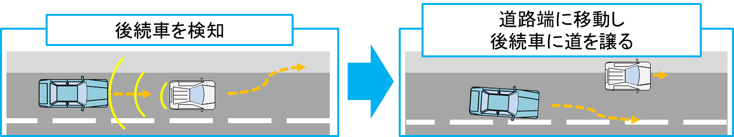 近年、高齢者等の移動弱者の生活をサポートするために低速自動運転車両による支援が注目されている。しかし、低速自動運転車両は巡航速度、最大加速度に制限があるため、道路巡行時に既存の交通流を妨げることが挙げられる。本研究では、低速自動運転車両が道路巡行中に後続車に道を譲るシステムを構築することを目的とし、後続車両を検知し、後続車両に対して退避開始すべきタイミングの検討を行った。さらに、乗客にとって乗り心地の良い退避軌道を生成する機能に関する検討を行った。具体的には、一定の減速度を想定した場合に最も横加速度が小さくなる、なめらかな退避軌道を生成し、等価二輪モデルや非線形四輪車両モデルを用いた追従シミュレーションによりその有効性を検証した。