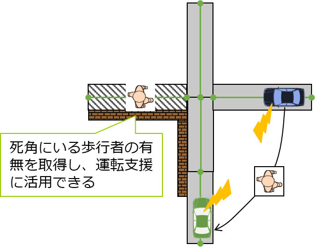 他車のセンサによって発見した周辺の交通参加者情報をダイナミックマップと共有することにより、自車の死角にいる歩行者等の早期発見が期待されている。