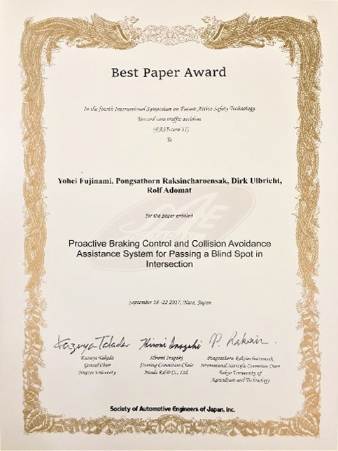 本研究は、交差点右折時において、死角からの飛び出しとの衝突を回避するリスク予測自動ブレーキ制御システムに関するものである。危険予測ブレーキシステムは、仮に死角から二輪車などが飛出してきたとしても緊急回避ブレーキで十分止まれる速度まで予め減速するシステムである。さらに、飛出してきた対象に対し、緊急回避自動ブレーキの作動によって衝突を回避する。実験車両を用いて危険予測ブレーキシステムの有効性を検証した。
