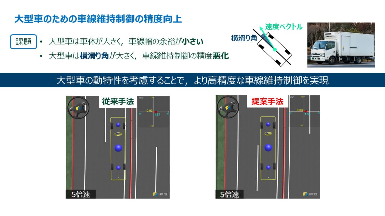しかし、ホイールベースが長い大型車は、大きな車体横滑り角を発生するため、その横滑り角を無視して車線追従制御を行うと、大きい追従誤差が残ってしまう問題がある。