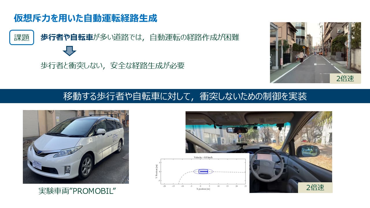さらに、交通参加者に対する仮想斥力に加え、走行可能領域を考慮した、より安全かつ自然な経路計画手法を考案し、実車実験によりその制御システムの有効性を検証している。