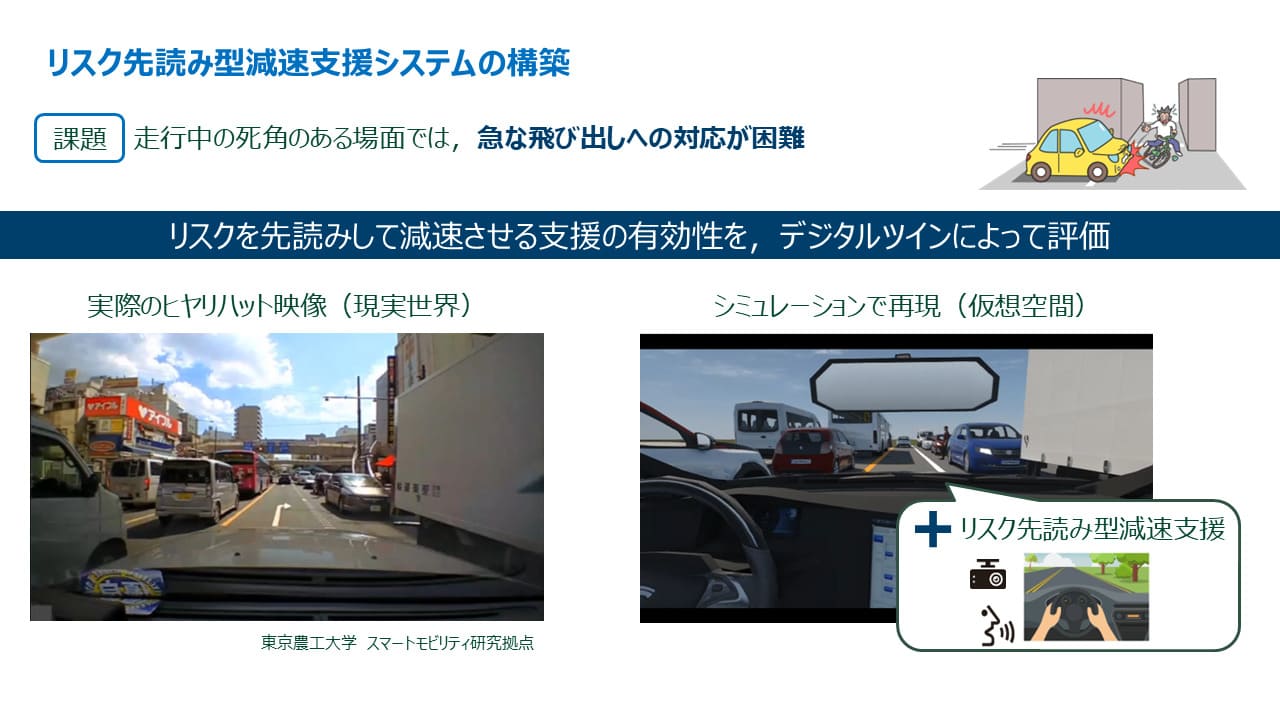 本研究では、ヒヤリハットデータをデジタルツインによって再現し、リスク先読み型減速支援システムの有効性を確認している。
