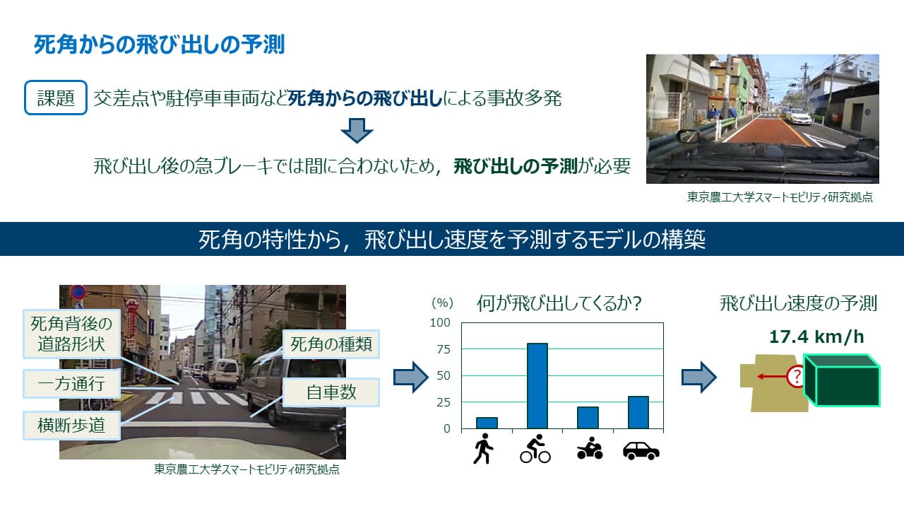 本研究では、出会い頭事故のリスクを低減する知能化運転支援システム実現を目標とし、死角から飛び出す対象の特性を予測するモデルの構築に取り組んでいる。