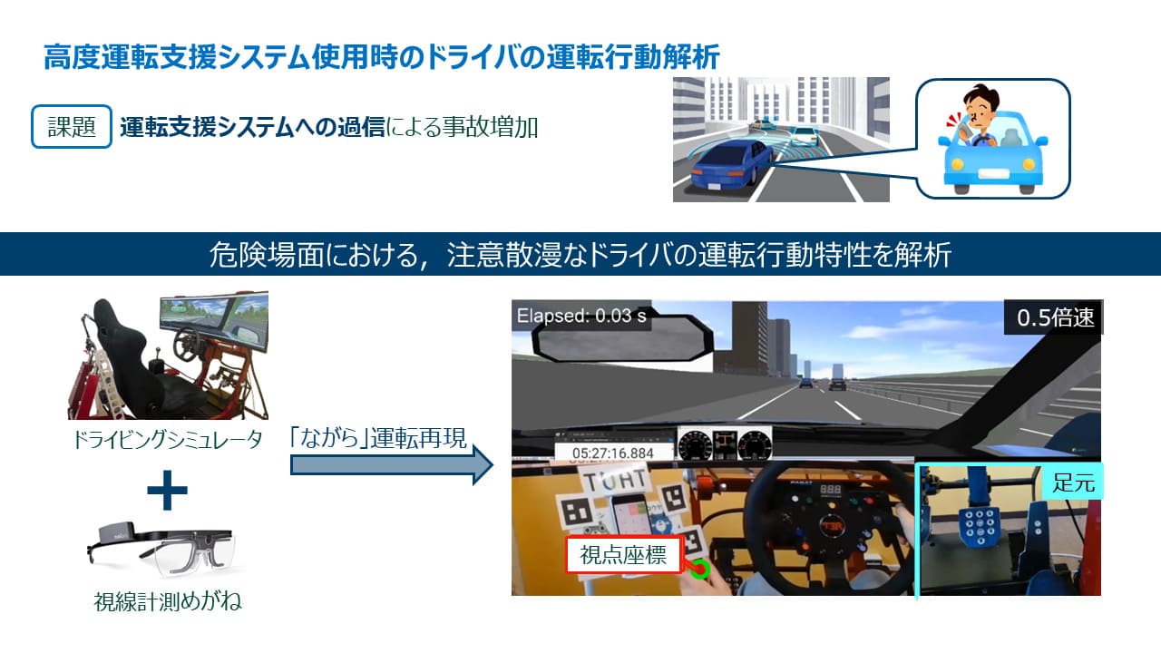 また、ドライビングシミュレータおよび実車による実証実験も行っている。