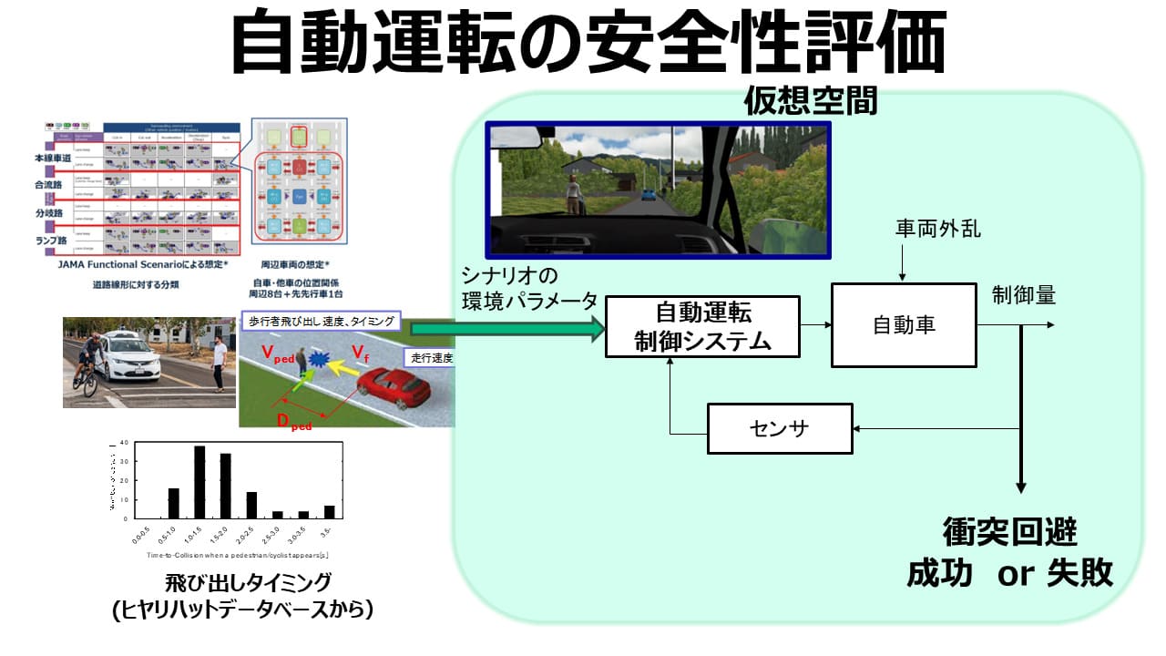 一方で、自動運転システムに関する安全性評価は「認知」「判断」「操作」を自動システムが行うため、実車走行による評価では限界があり、仮想環境での走行シミュレーションが期待されている。